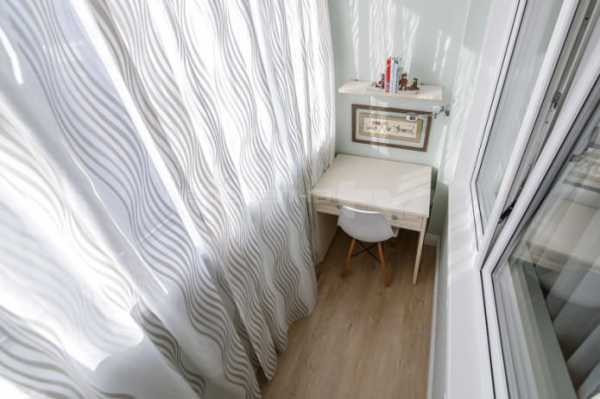 Лоджию, примыкающую к комнате, превратили в небольшой кабинет, в котором обустроили рабочий стол, а также еще одну систему хранения.