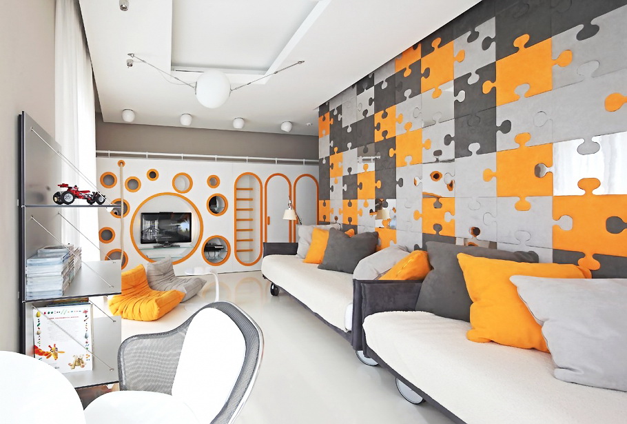 Внесите яркие краски с помощью аксессуаров, которые в любой момент можно убрать или заменить. Это могут быть подушки, плакаты, габаритные игрушки, пуфики и др. В этом случае не возбраняется даже красный цвет.