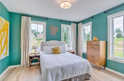А остальные стены можно окрасить общим колером удивительного пейзажа. Отличным дополнением станет красивая кровать в спальню с покрывалом оттенка, сочетающегося с цветом стен.