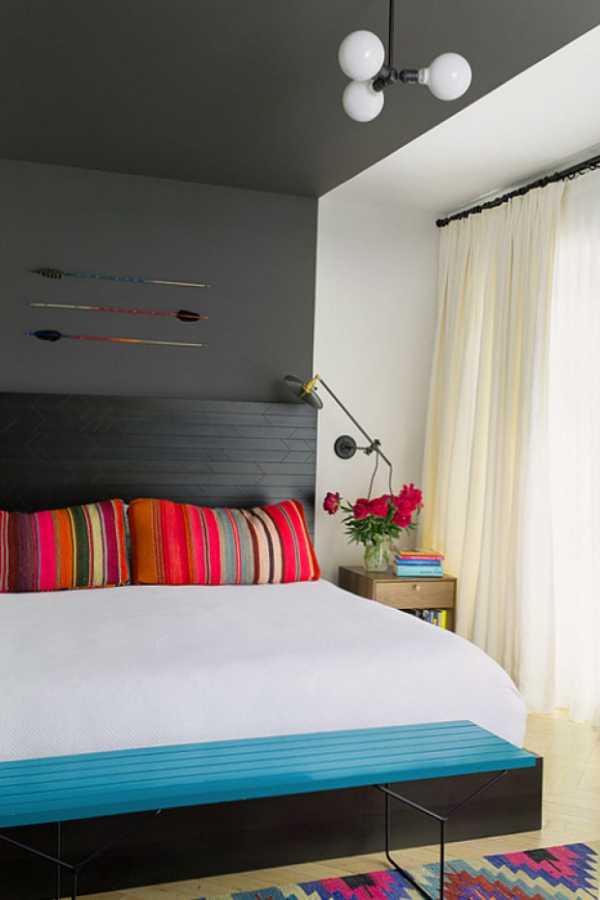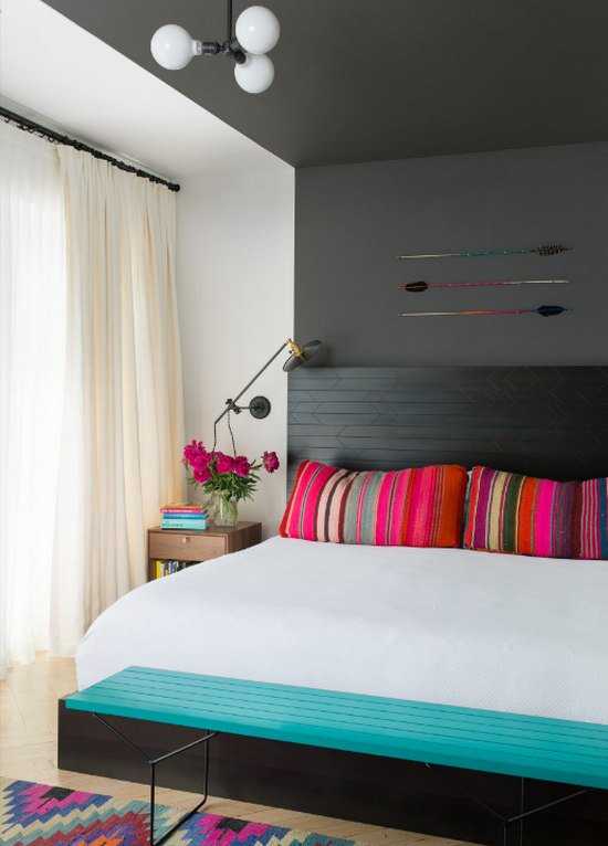 Стена за изголовьем кровати – акцентная, ее выделяют контрастным цветом, фактурной отделкой, графикой. Дополнительные яркие пятна в оформлении: подушки, обивка кресел, шторы.