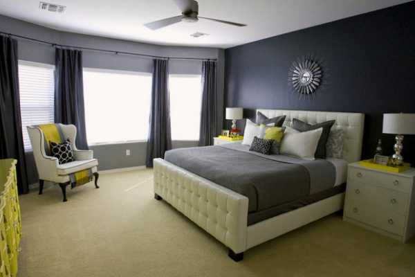 Для мужской спальни лучшим цветовым оформлением станут серые, синие тона, черно-белый контраст.