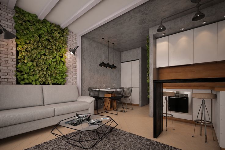 Барные стулья и барная стойка на кухне визуально отгородят ее от остальной части квартиры. Большой мягкий диван может служить центром отдыха и развлечения. Деревянный стол и удобное кресло выделят зону работы.