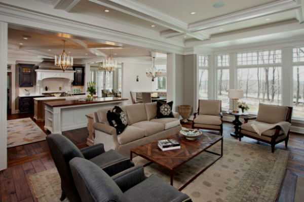 Классический и современный стиль в оформлении гостиной, совмещенной с кухней