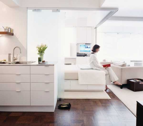 - дивана. За его спинкой можно установить стеллаж или тумбу, полностью отделив кухню от сидящего на диване человека;