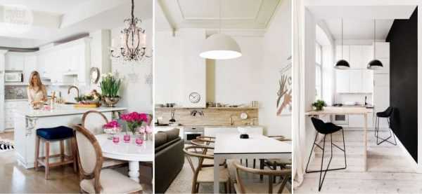 К современным решениям относится создание интерьера кухни столовой гостиной, зонированных барной стойкой.