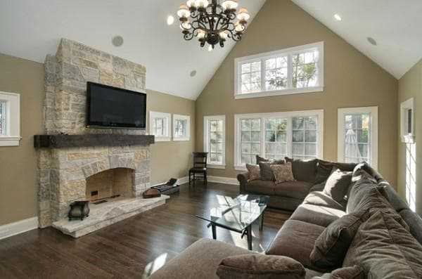 Если вы хотите установить в гостиной телевизор, то его ни в коем случае нельзя располагать рядом с камином. Телевизор и камин – противоборствующие предметы в интерьере, посему их нужно располагать в разных зонах.