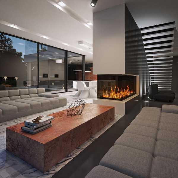 Размещенный в углу камин дает меньшую теплоотдачу, но своей интересной конструкцией создает оригинальный и наполненный интерьер.