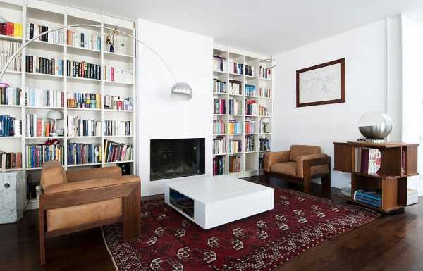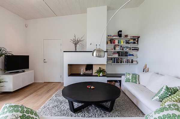 Если стена, у которой находится камин узкая, то не рекомендуется непосредственно вблизи неё размещать диван или книжный шкаф. Здесь лучше обойтись более компактными предметами.