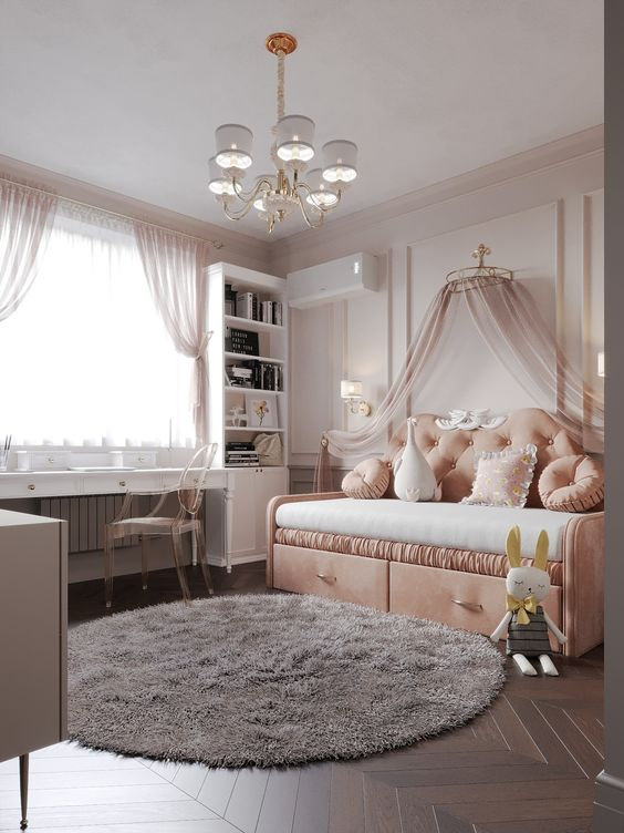 Белый пушистый ковер будет хорошо сочетаться с любой цветовой гаммой в комнате вашей дочери.