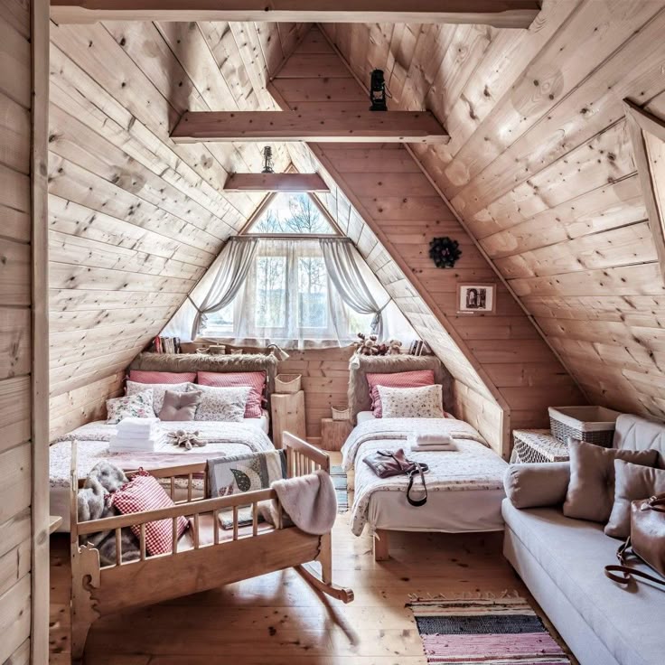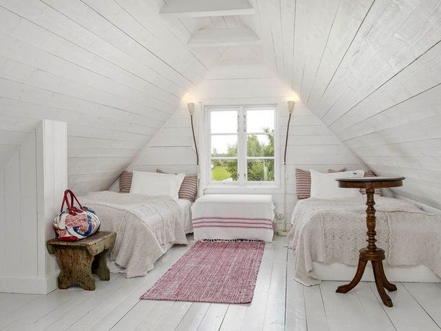 Если вы хотите создать дополнительную спальню для посещения семьи, идеи спальни на чердаке предлагают большой потенциал. Максимально используйте неудобные карнизы, разместив детские кровати под ними и оденьте подходящее постельное белье, чтобы создать гармоничную схему.