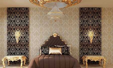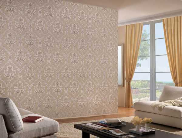 - Для классических интерьеров лучшую пару составят кремовые однотонные обои и полотно с золотистым дамасским узором.