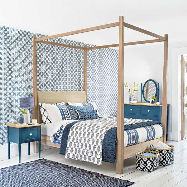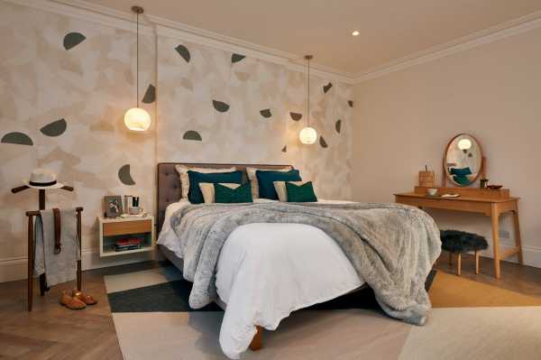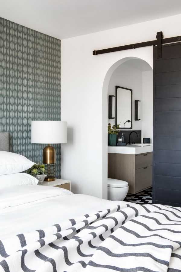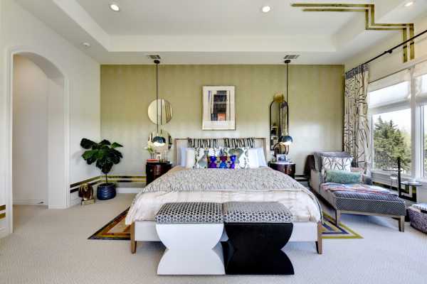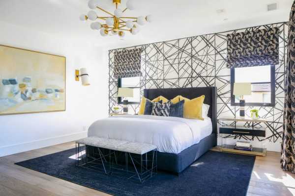 Отходите от стереотипов! Современный дизайн спальни предполагает использование более броских материалов, например, обоев насыщенного оттенка с крупным геометрическим принтом. Правда, стоит отметить, что на таком фоне лучше будет смотреться мебель с простыми формами и однотонные шторы.