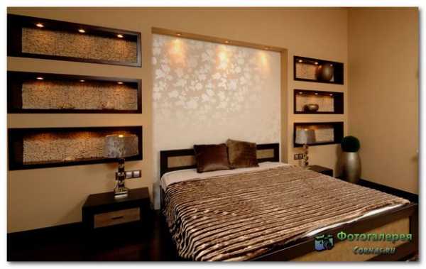 Таким образом обычно выделяют изголовье кровати, но часто это сопряжено с работами связанными с формированием, каких то эстетических элементов, выполняемых из гипсокартона: различные ниши, разноуровневые потолки и др