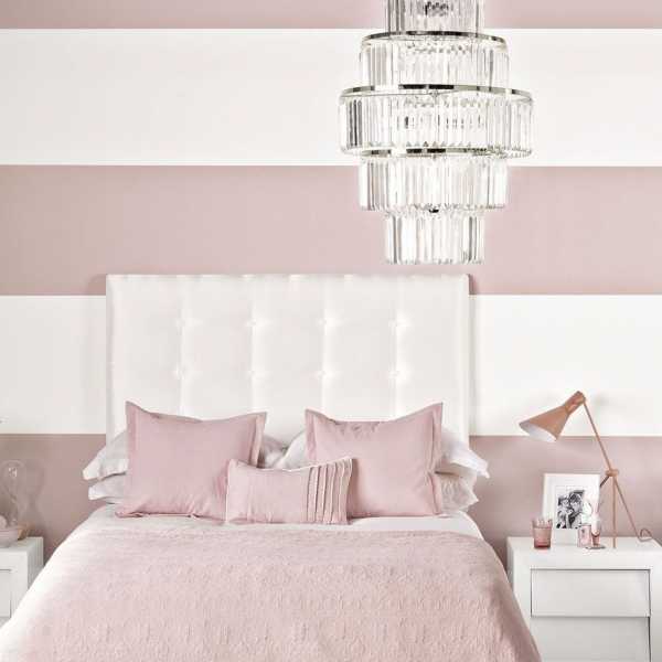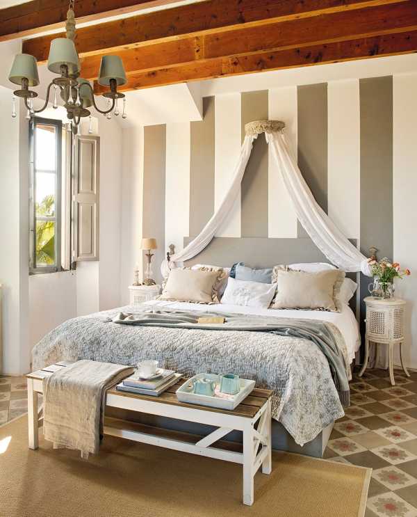 - И наоборот, если вы имеет спальную с широкую, но с низкими потолками, то можно воспользоваться материалом с вертикальным рисунком.