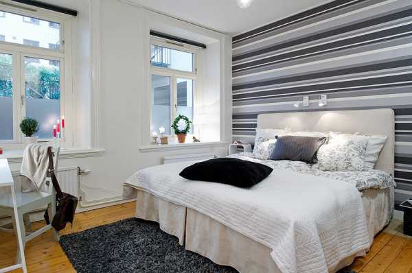 Вертикально расположенные полосы обоев контрастного оттенка избавляют от необходимости продумывать дополнительный декор. Они создают впечатление объема небольшой спальни.