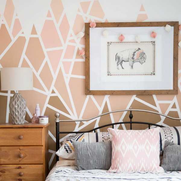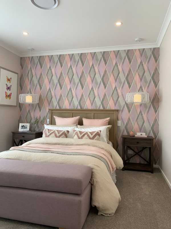 - Выбирать обои с диагональными рисунками: это визуально расширит комнату. Для достижения такого же эффекта, можно по диагонали наклеить на обои пастельных тонов декоретто.
