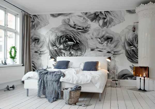 Стильно и современно смотрится сочетание белых обоев и темно-серого или полотна с цветочным принтом или вензелями. Последнее, обычно, размещают на стене за кроватью.