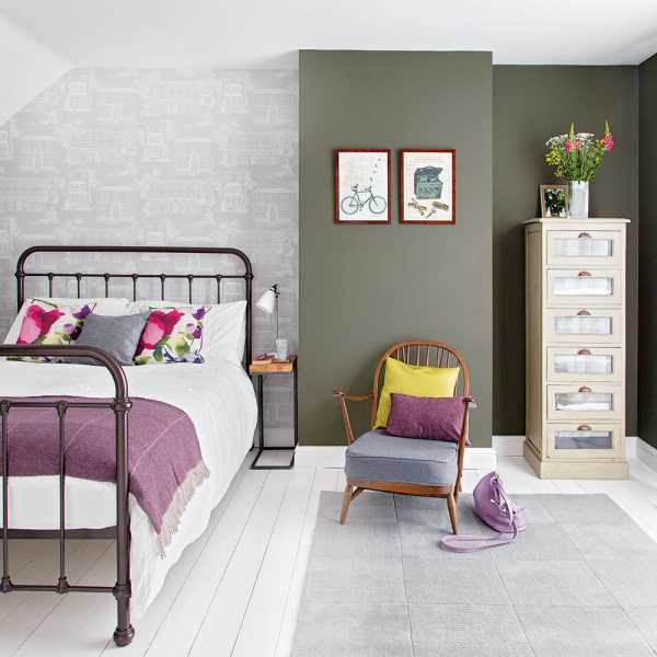 Перед декором маленькой спальни стоит важная задача визуально увеличить пространство. Сделать это можно с помощью белой мебели и обоев, ассиметричной поклейки парных полотен.