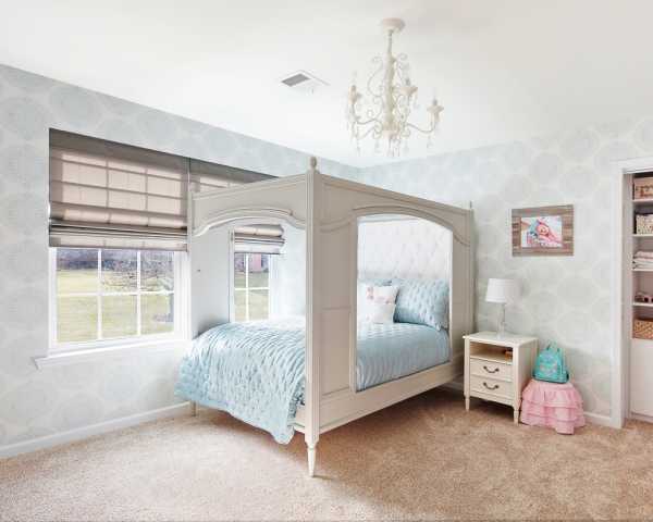 - Для спален в скандинавском стиле в качестве второго полотна подойдут белые обои с голубым рисунком “домик”.