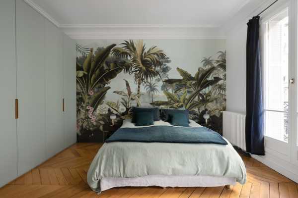 В спальне добиться французской стилистики можно фотообоями с иллюстрацией старинных городков, булочных и кафешек. Наиболее актуальными оттенками считаются зеленый, голубой, бежевый, розовый с нежными цветочными принтами.