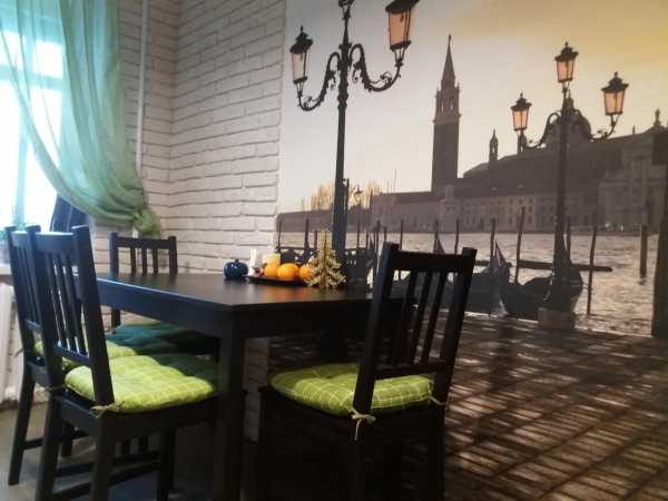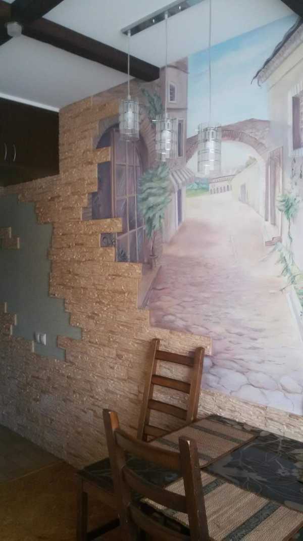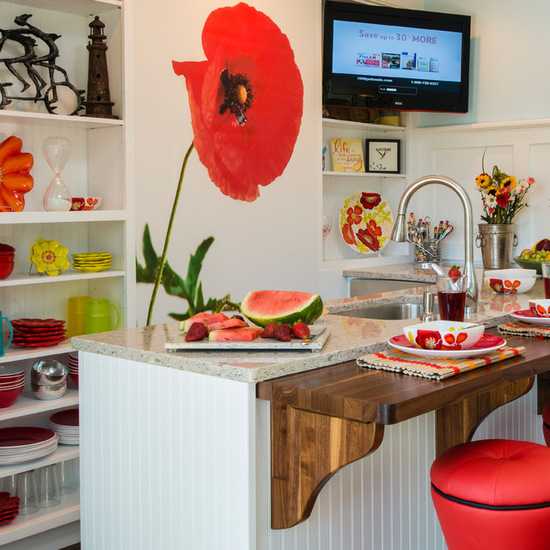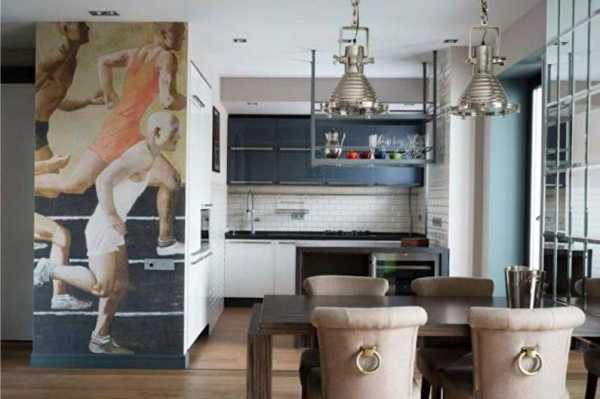 Так на участке для приготовления пищи будет уместна имитация плитки, камня, кирпичной кладки, а гостевую часть украсят более нарядные обои, например, с шелкографией, необычные фотопанорамы или даже эксклюзивные рисунки от руки. При этом желательно сохранять общие стилистические черты и придерживаться единой цветовой палитры.
