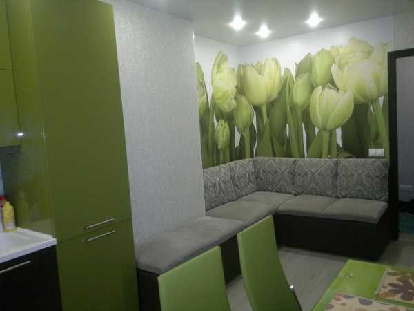 Текстильные зеленые полотна с тиснением отлично дополнят белый натяжной потолок, а также темный кухонный уголок из натурального дерева. Такой вариант оформления уместен в помещении с 12 кв. метрами. Если у вас малогабаритная квартира, и кухня не может похвастаться лишними кв. метрами, лучше воздержаться от пестрых отделочных материалов, ярких рисунков. Многие современные хозяйки предпочитают выбирать бытовую технику серебристых тонов.