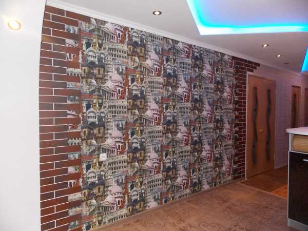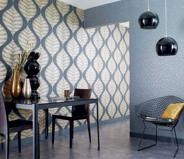 Также допустимы фотообои, неброские монохромные рисунки, чередование глянцевых и матовых текстур, эффект полированного камня, дерева, металлический блеск.