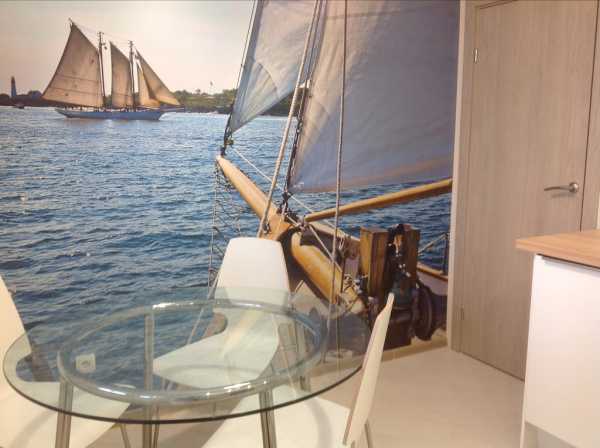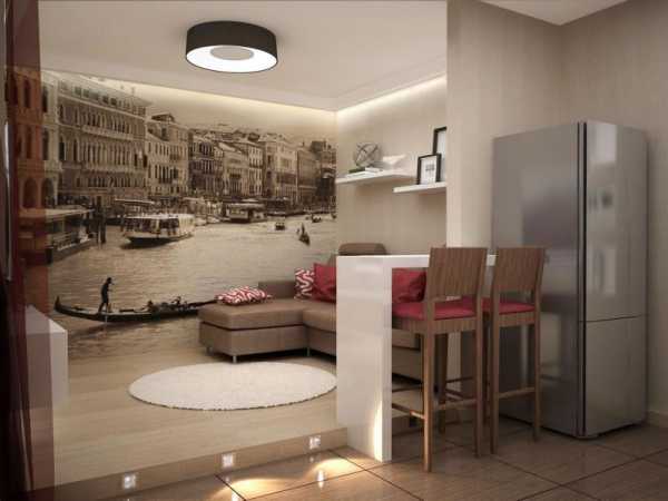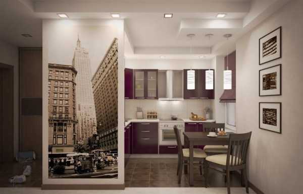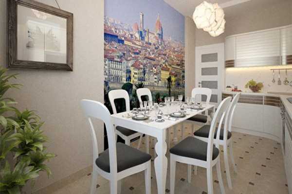 Фотообои – один из самых простых способов зонировать пространство кухни. Они разделят функциональные зоны и визуально обозначат нужные места. В тесном помещении будьте аккуратны с объемными рисунками, поскольку они могут сконцентрировать всё внимание на себе и сжать и без того дефицитную площадь.