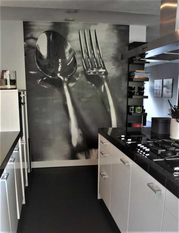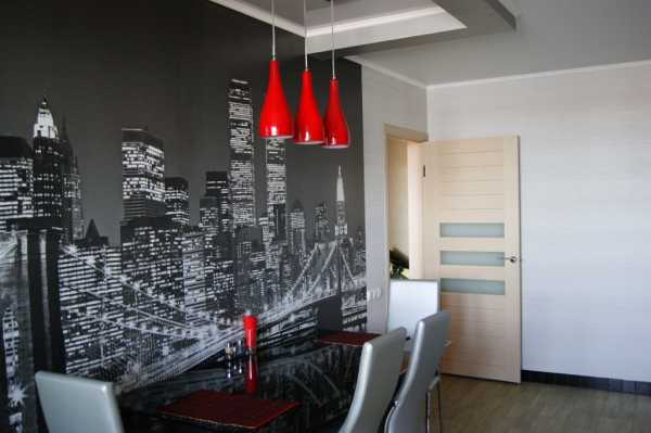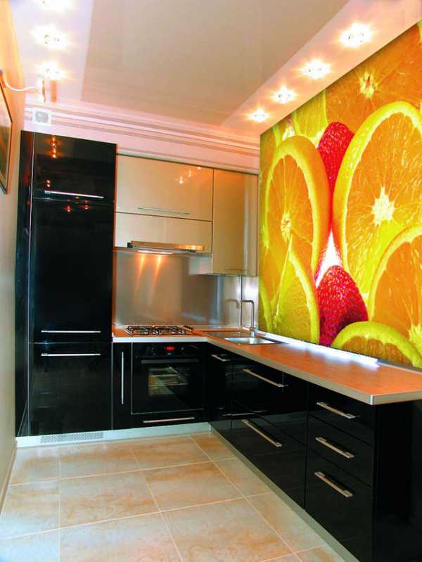 Часть стены, оклеенная контрастными фотообоями, сделает однотонный интерьер по-настоящему живым и активным. Для этих целей прекрасно подходит популярный черный или любые яркие цвета. Главное – не перенасытить кухню контрастами, это действует подавляюще и психологически усложняет пребывание в комнате.