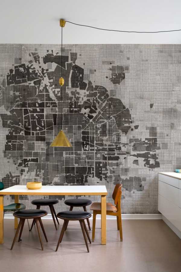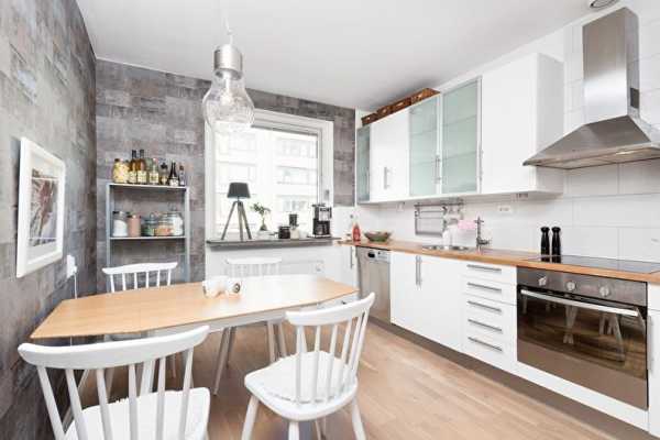Фотообои могут быть светлые и абстрактные, но можно подобрать и контрастные изображения мегаполиса, реалистичные узоры древесины или камня – все это будет прекрасно смотреться в скандинавской кухне.