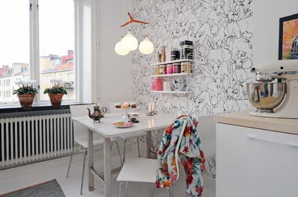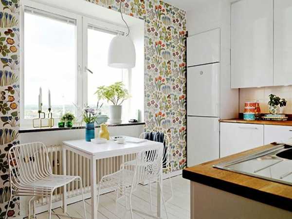 Белоснежный и близкие к нему пастельные цвета обоев представляют собой идеальный фон для любых дополнений. Такие стены сделают кухню просторнее, а любые контрастные рисунки и яркая мебель будут смотреться максимально выигрышно.