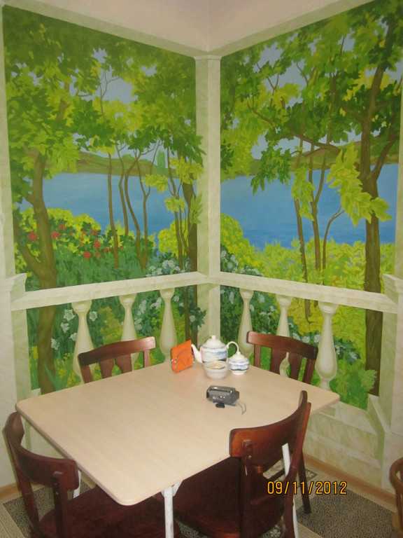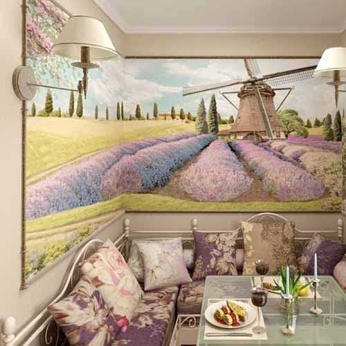 Если необходимо немного «раздвинуть» помещение кухни вширь, тогда следует использовать рисунки бескрайних пустынь, широкой водной глади, виднеющихся вдали горных вершин, голубого бездонного неба, и тому подобное.