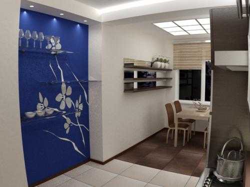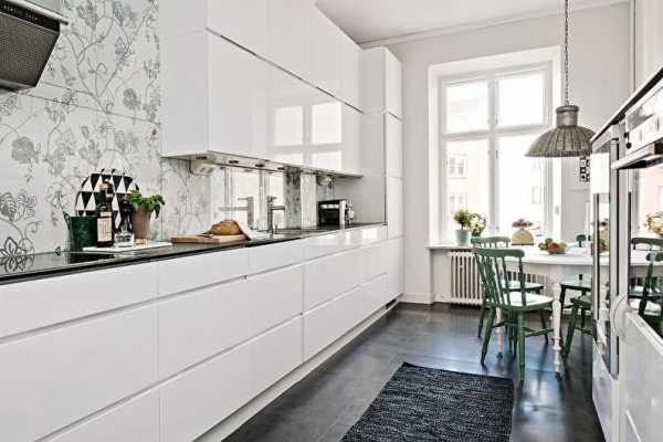 Фотогалерея, предлагаемая профессионалами, помогает подбирать материалы для дизайна нужного цвета, фактуры. Среди особенностей кухни – наличие полноценной рабочей зоны, поэтому дизайн данного помещения (на фото) предполагает комбинирование обоев с керамической плиткой, мозаикой, стеклом.