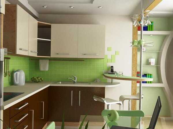 Например, одну стену в кухне (9-12 кв. метров) можно сделать зеленого цвета (пример на фото), а остальные поклеить бежевыми материалами, такое сочетание имеет гармоничный вид.