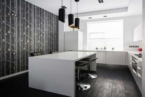 Продумывая проект будущего интерьера, нужно не просто подобрать обои, но и продумать, как оформить потолок, пол, какие дополнительные детали можно использовать для дизайна (на фото представлен вариант оформления интерьера в кухне обоями).