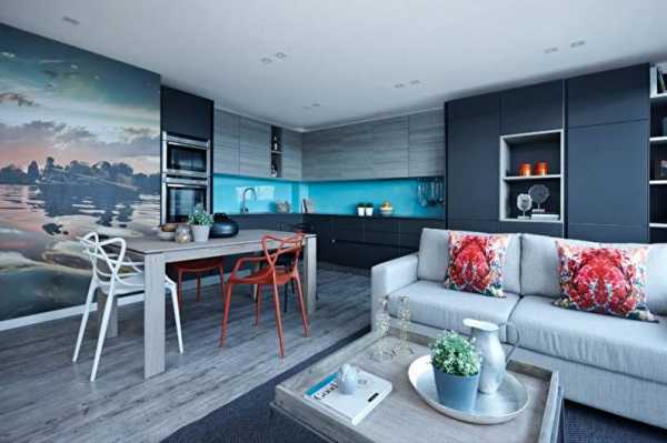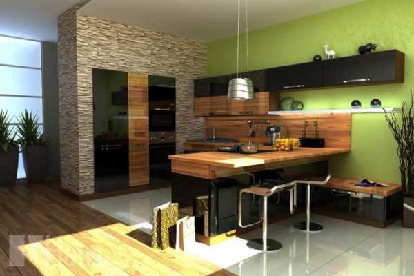 В квартирах-студиях, где кухня совмещается с гостиной, отделка стен поможет красиво зонировать пространство.