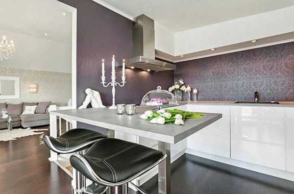 Фиолетовые обои, имеющие тиснение, можно назвать истинным украшением и акцентом современной кухни. Такие стены будут отлично сочетаться со светлыми шкафами, а также с расписной посудой. Для стиля «модерн» подойдут черно-белые рисунки. Если дополнить подобную цветовую гамму зеркальными осветительными элементами, белоснежные шкафы будут выглядеть просто изысканно.