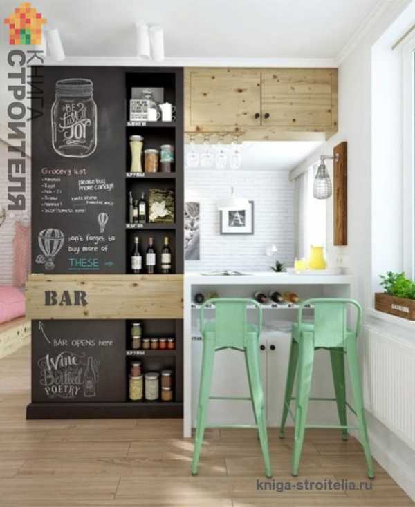 Барная стойка не менее удивительна, чем сооруженный в гостиной подиум — спальня. Стойка, которая стала сразу и перегородкой отделяющей кухню от гостиной и обеденным столом была стилизирована в стиле кантри. («Столярный инструмент» , «Островная кухня. способы обустройства и стили оформления» , «Гостиная с барной стойкой своими руками. варианты с фото. » ). Окрашенная в черный цвет и украшенная тематическими надписями барная стойка наполнила атмосферу кухни и гостиной особым колоритом.