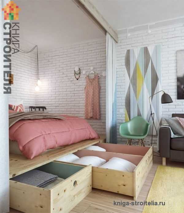 Начнем изучение указанных конструкций с деревянного подиума. Его удивительная конструкция продумана таким образом, что получилось рационально использовать все образовавшееся под ним дополнительное пространство. Подиум оборудован выдвижными ящиками и подъемными крышками (в результате получаются своеобразные встроенные сундуки). Вместительные ящики на колесах позволяют компактно поместить в них подушки, одеяла и другие нужные, но не всегда востребованные вещи. («Дсп в интерьере. виды и способы обработки» , «Возводим подиум. фото в интерьере» , «Детская кровать подиум с книжным шкафом» , «Мобильный деревянный дом на лыжах своими руками» ). Кроме этого, вместе с подиумом была установлена и стационарная перегородка, разделенная на две части и выполняющая функцию шкафа с вешалками в спальне и в прихожей. («Установка гипсокартонной перегородки» , «50 вариантов оформления гардеробных комнат и шкафов» , «Шкаф купе своими руками. фото. » ). Фото интерьера однокомнатной квартиры . (Рис. 8, 9)