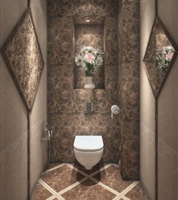 Маленькая площадь туалета может быть покрыта однотонным наливным полом, напоминающим глянец, что в сочетании со светом придаст помещению дополнительный простор. Идеальный выбор – это 6 или 8-угольная плитка с мелкими узорами. Крупные рисунки и громоздкие орнаменты будут делать туалет еще уже, потому стоит их избегать.