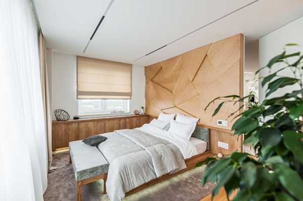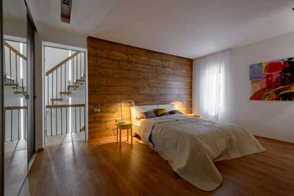 Современный дизайн допускает присутствие в разных стилях необработанного камня и не оштукатуренных стен, если того требует задумка дизайнера. Отделка деревом зоны у изголовья кровати также является весомым акцентом в пространстве комнаты.