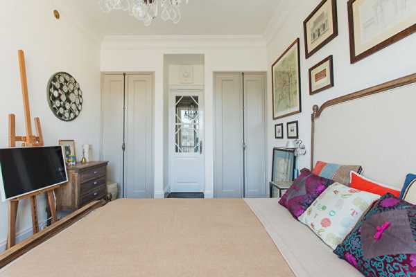 Множество безделушек и цветы в вазонах, занавески из ситца и светлая мебель придадут спальне легкость и воздушность, несмотря на ее размеры.