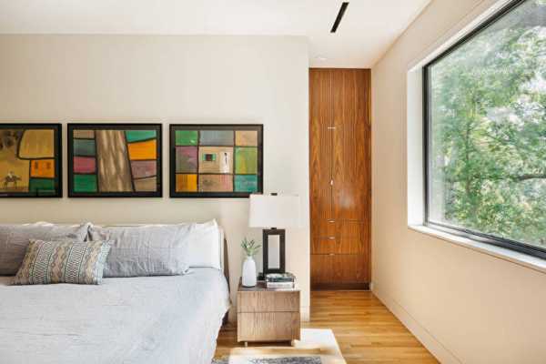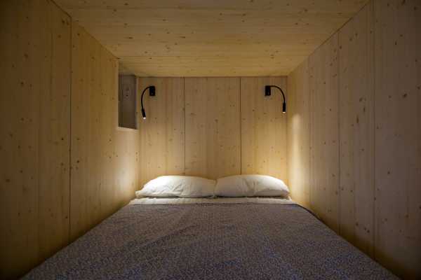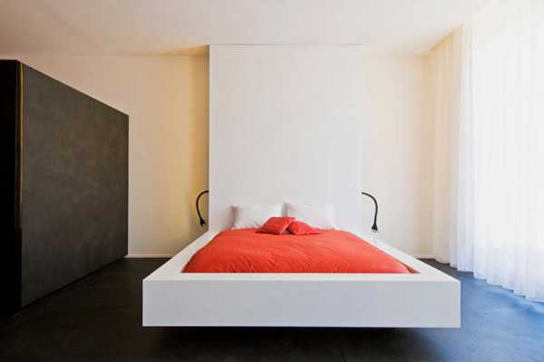 Самые необходимые предметы мебели, буквально кровать и тумбочка, полное отсутствие драпировок и безделушек организуют спальное пространство без эффекта захламленности.