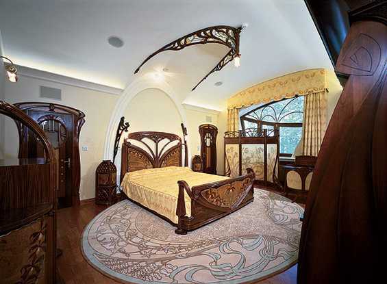 Броский и смелый, несколько аристократичный и утонченный стиль предполагает плавные, изогнутые линии. Они используются в силуэтах мебели, повторяются в контурах натяжного потолка, дверных и оконных проемов.