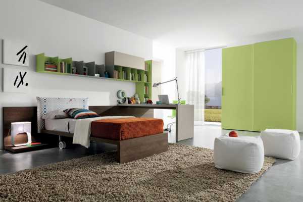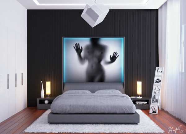 Как основной акцент на стенах можно использовать декоративные панно и фотообои с популярными темами урбанизма, абстракции или макросъемки, они также будут уместны на фасадах мебели, подойдет также имитация под кирпич или камень, отделка деревом. Это даст возможность выделить прикроватную зону.