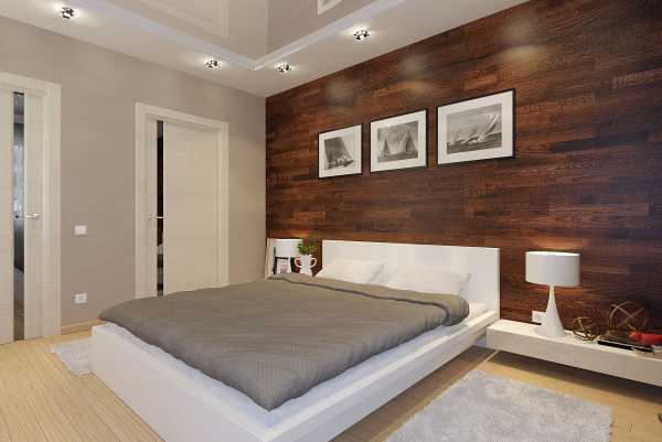 Уудачный пример декорирования стены в спальни темным деревом