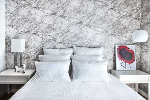 Для выделения прикроватной зоны в современном дизайне могут использоваться фактурные обои или штукатурка, дерево, кожа и имитация под камень, или открытые стеллажи.