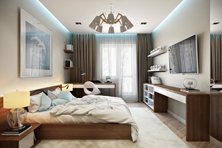 Здесь с выбором оттенков нужно быть осторожнее. Чтобы быстро засыпать и хорошо высыпаться, лучше всего оформить спальню в спокойной цветовой гамме. Нейтральные и пастельные оттенки успокаивают. Лучшие варианты – белая спальня, серая, бежевая, коричневая. Если такие варианты кажутся вам слишком скучными – можно использовать оттенки синего, желтого и зеленого. Другие цвета можно вводить в интерьер дозировано и с осторожностью, в качестве цветовых оттенков, желательно не видимых с кровати. Для маленькой спальни в современном стиле лучше выбрать светлые оттенки.