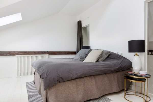 Можно использовать светильники без абажуров, такое решение смотрится весьма оригинально. На окнах обычно нет занавесок. В целом такое помещение напоминает нежилое, но это только внешне, на самом деле спальня практичная и удобная.