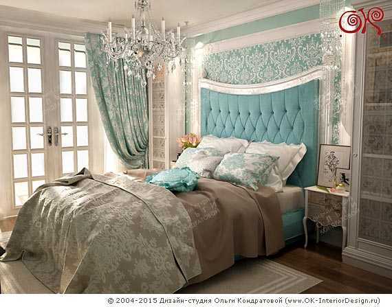 8. Белый и бирюза в дизайне спальни 15 кв. метров